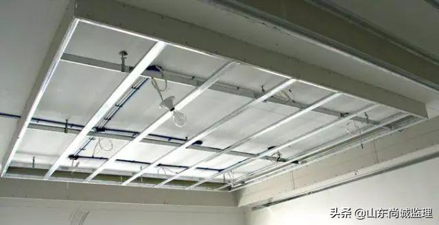技術交底→水電打壓→彈線→畫龍骨分檔線→安裝主龍骨吊桿→安裝主龍骨→安裝次龍骨→隱蔽驗收→安裝石膏板→刷防銹漆→安裝壓條→清理