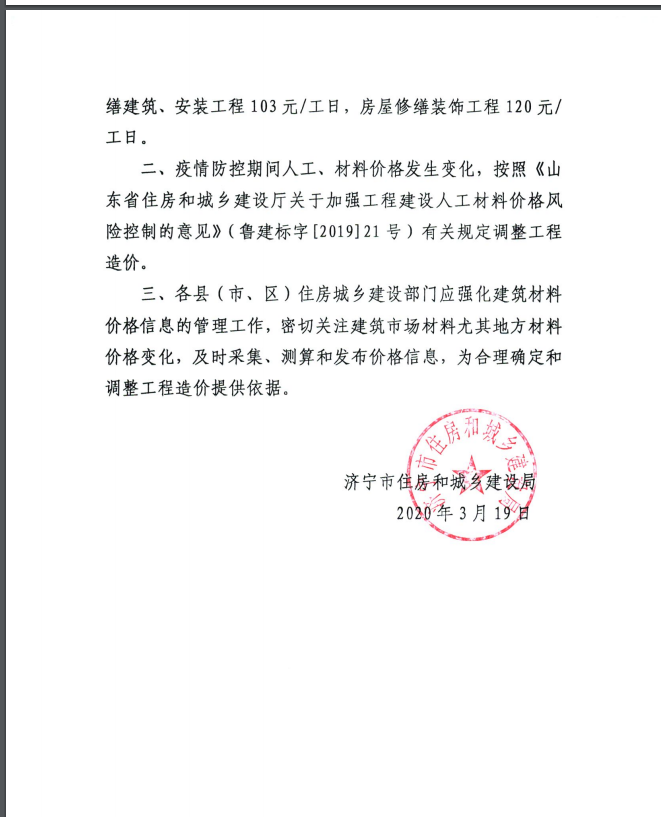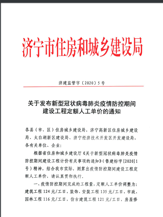 濟建監(jiān)管字〔2020〕5號關(guān)于發(fā)布新型冠狀病毒肺炎疫情防控期間建設(shè)工程定額人工單價的通知