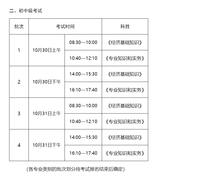 初中級考試于10月30日、31日舉行,分兩天上、下午4個批次實施(附件)。各級別及專業(yè)類別的具體考試時間和批次劃分視報名情況另行確定。